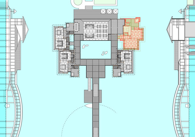 The solution proposed here is to create a garden in the water, reminiscent of the stone garden of Ryoanji, surrounded by pavillions reflective of Itsukushima Shrine on Miyajima Island. The guest suite module was developed as a case study for the entire resort project.